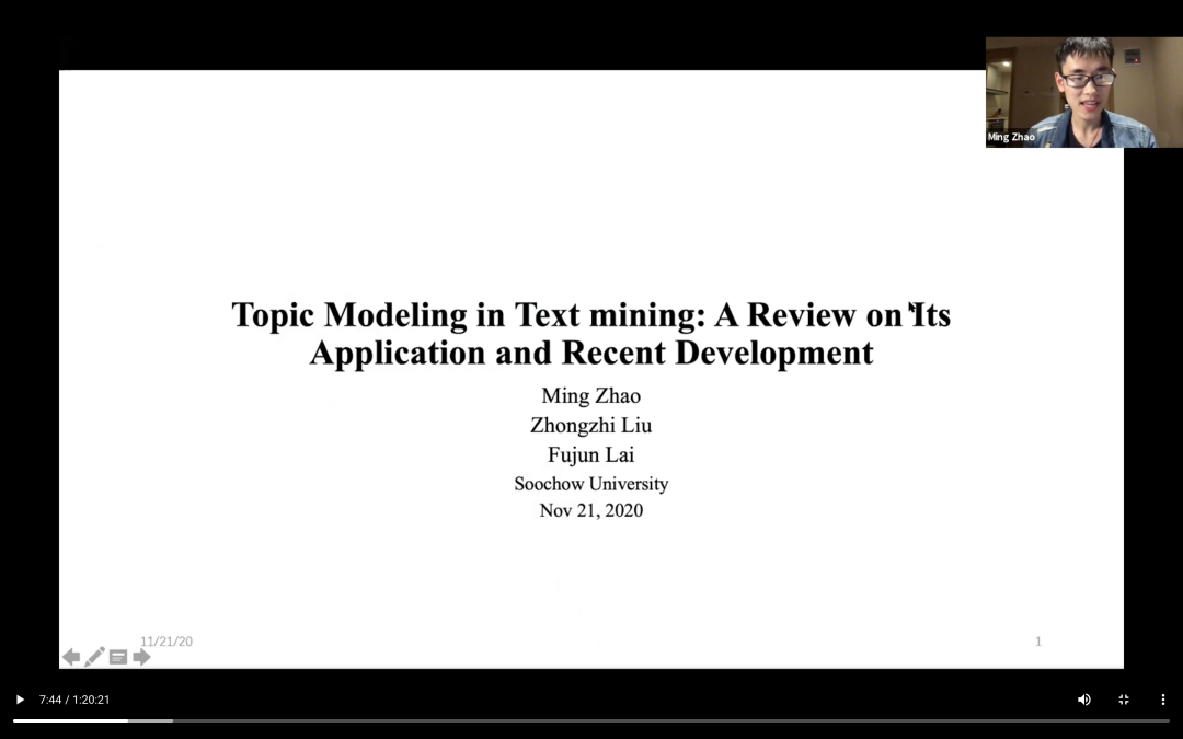 2020年11月21日,东吴betway西汉姆联电子商务系2017级本科生赵明同学应邀参加国际决策科学协会(Decision Sciences Institution,DSI)第51届学术年会,在其“文本分析与运用”(Text Mining and Applications)分会场中担任主持人(Session Chair),并报告自己阶段性科研成果。赵明同学的报告围绕大数据背景下文本信息分析中主题模型(Topic Modeling)的运用与最新发展,内容跨界计算机科学和信息决策技术,受到参会教授的一致好评。该研究在bw必威西汉姆联智慧供应链研究中心刘忠志博士指导下完成。