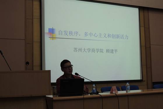最后,由东吴betway西汉姆联经济系教授顾建平老师为全院研究生带来了一场名为《自发秩序,多中心主义和创新活力》的主题讲座。顾老师以生动幽默又不失学术严谨的语言深入浅出地分析了社会发展过程中自发秩序与人为秩序的平衡问题,指出社会的健康发展与创新活力都源于自发秩序,而自发秩序又源于人们共同遵守的基本道德准则。讲座结束后,同学们积极提问,并就讲座中的相关观点与顾老师进行探讨,顾老师对同学们的提问一一耐心解答。